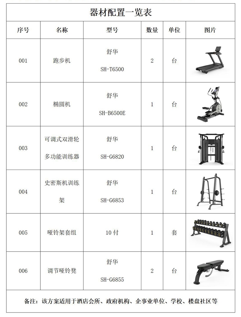 此方案要求面积小于40平米,我们会根据您个人的实际情况和场地面积而定。此方案推荐小型单位健身房、酒店会所健身房配置。能满足5-10人同时健身使用。