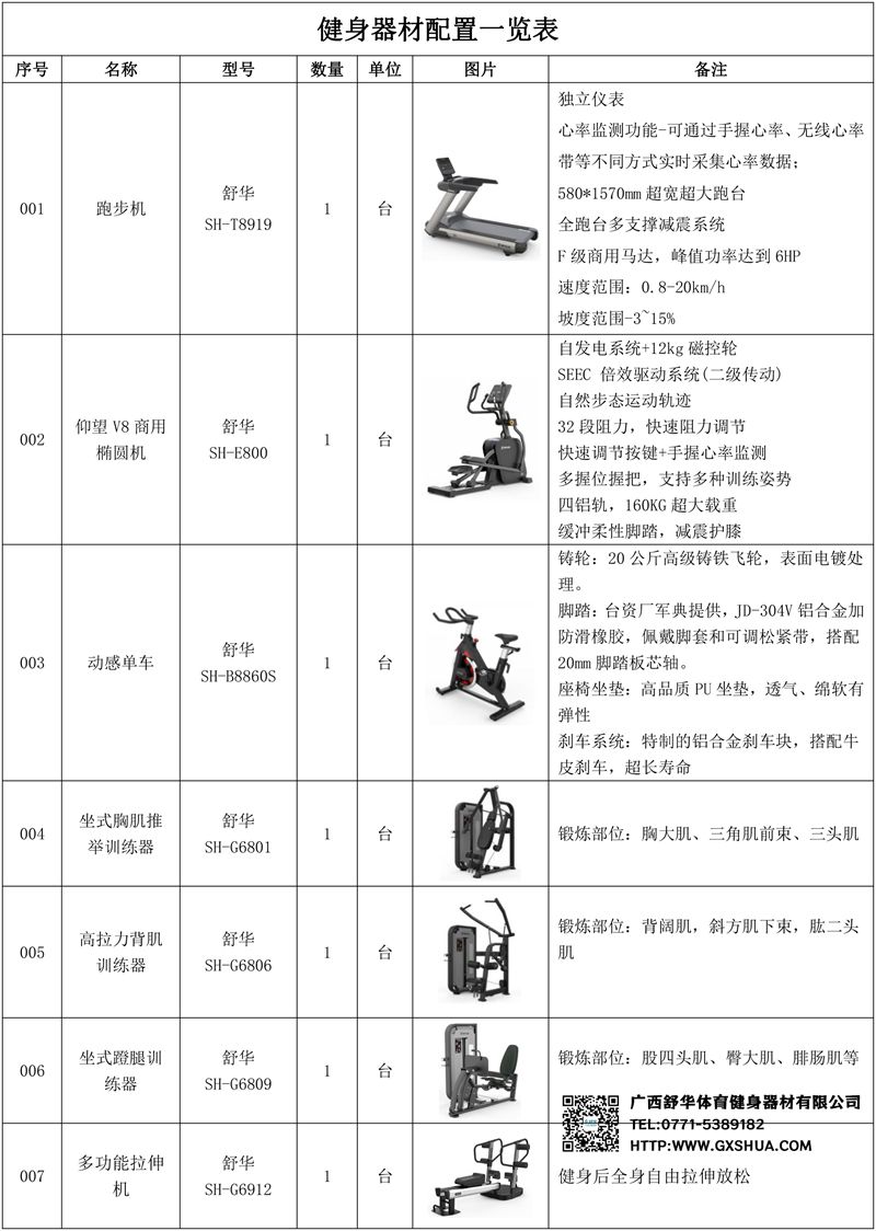 1.米兰V9智能跑步机SH-T8919*3台-独立仪表-简洁大气,全新外观设计,健康运动新选择;心率监测功能,可通过手握心率、无线心率带等不同方式实时采集心率数据;580*1570mm超宽超大跑台-跑感舒适,跑台整体安全稳定;全跑台多支撑减震平台,保证跑台超强支撑力,达到180kg支撑,满足专业健身房需求。F级商用马达-超强马达,AC 3.0HP 交流,峰值功率达到6HP,F级商用品质。速度范围达到0.8-20km/h;V9跑步机可实现跑台扬升功能,坡度范围-3~15%,满足客户不同的锻炼需求。
