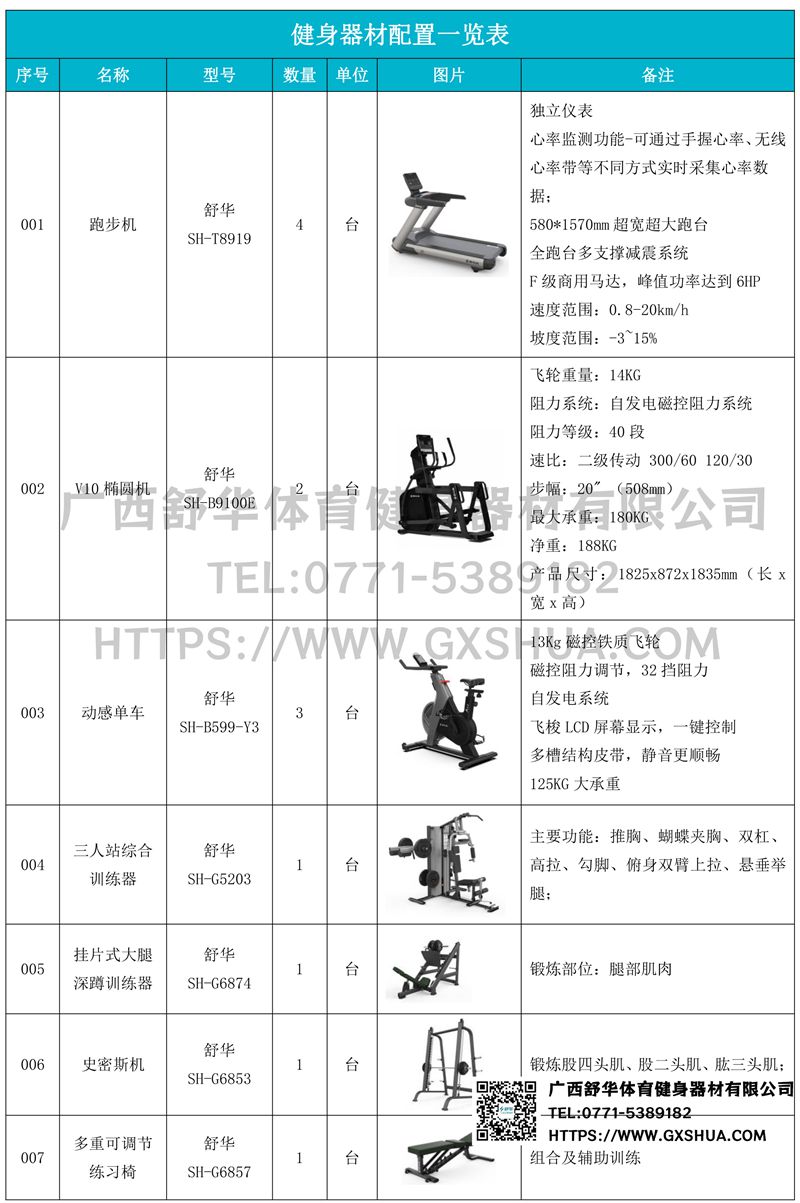 1.米兰V9跑步机SH-T8919*4台-独立仪表-简洁大气,全新外观设计,健康运动新选择;心率监测功能,可通过手握心率、无线心率带等不同方式实时采集心率数据;580*1570mm超宽超大跑台-跑感舒适,跑台整体安全稳定;全跑台多支撑减震平台,保证跑台超强支撑力,达到180kg支撑,满足专业健身房需求。