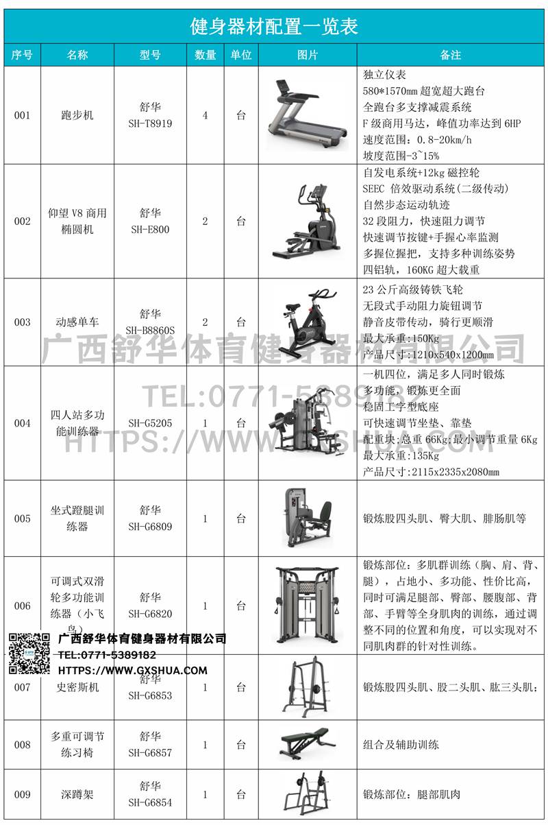 1.米兰V9跑步机SH-T8919*4台-独立仪表-简洁大气,全新外观设计,健康运动新选择;心率监测功能,可通过手握心率、无线心率带等不同方式实时采集心率数据;580*1570mm超宽超大跑台-跑感舒适,跑台整体安全稳定;全跑台多支撑减震平台,保证跑台超强支撑力,达到180kg支撑,满足专业健身房需求。