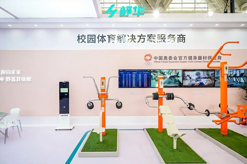 本届教育展,米兰展出9款校园体育产品,包含备受关注的星火+校园户外运动路径、趣味投篮训练器以及跑步机、椭圆机、综合力量训练器等。