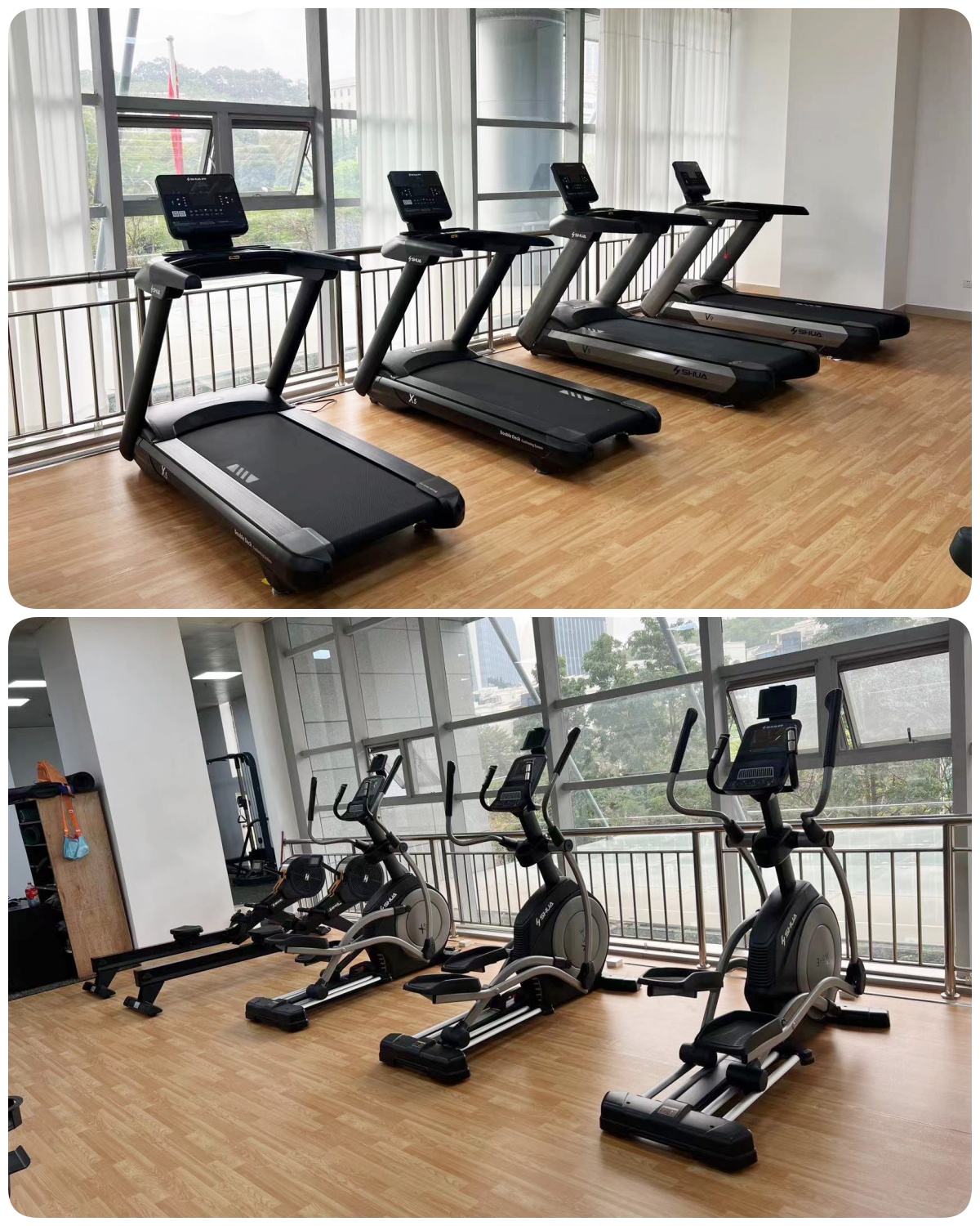 有氧区域主要配置了米兰X5跑步机、X5-E椭圆机、划船器SH-R8100、动感单车。有氧器材可以改善心肺功能、促进血液循环、提高新陈代谢、提升身体素质、提供了多样化的锻炼选择、能有效缓解工作压力和焦虑情绪,从而提高注意力和专注力,使员工在工作中更加冷静、高效。